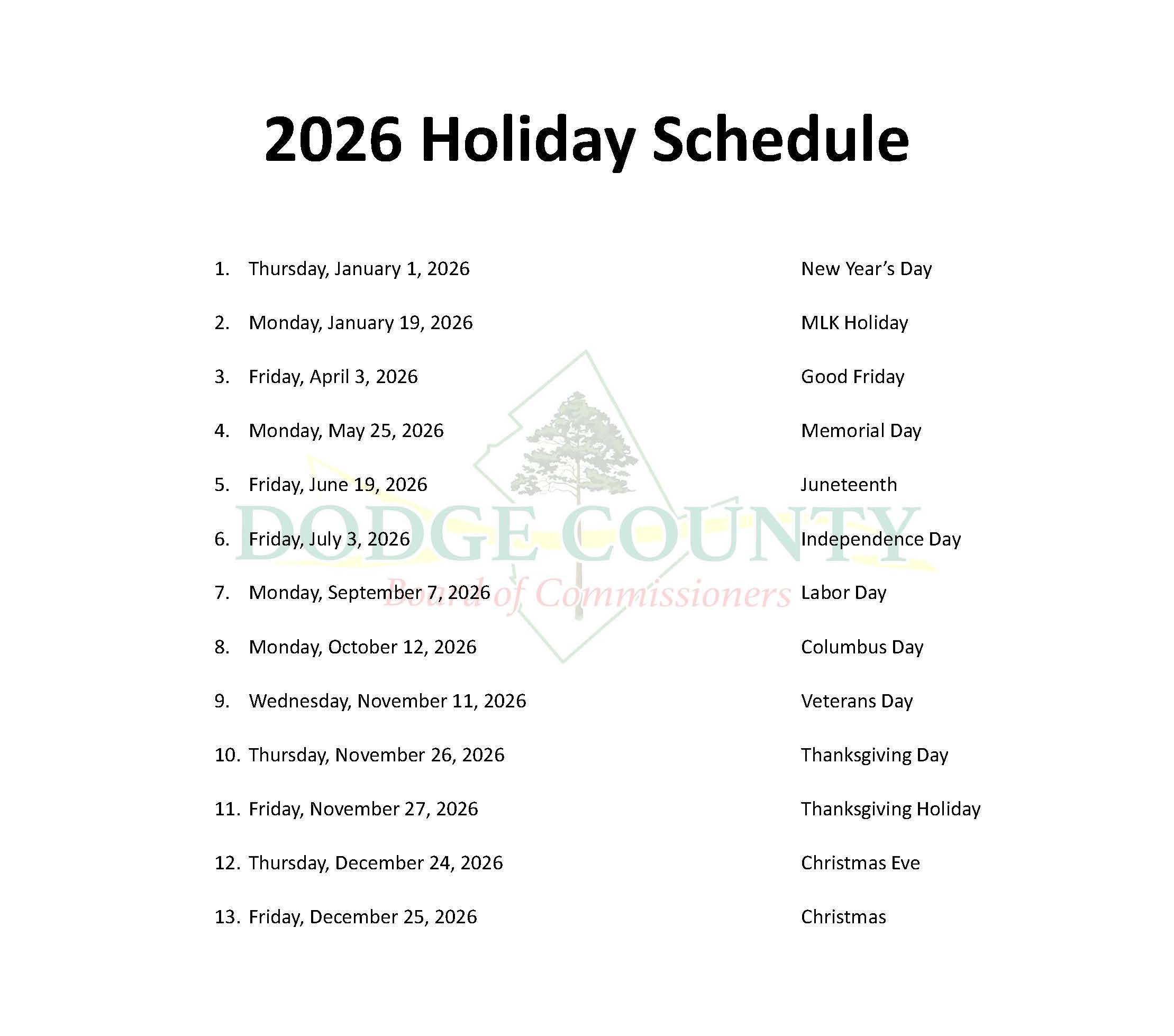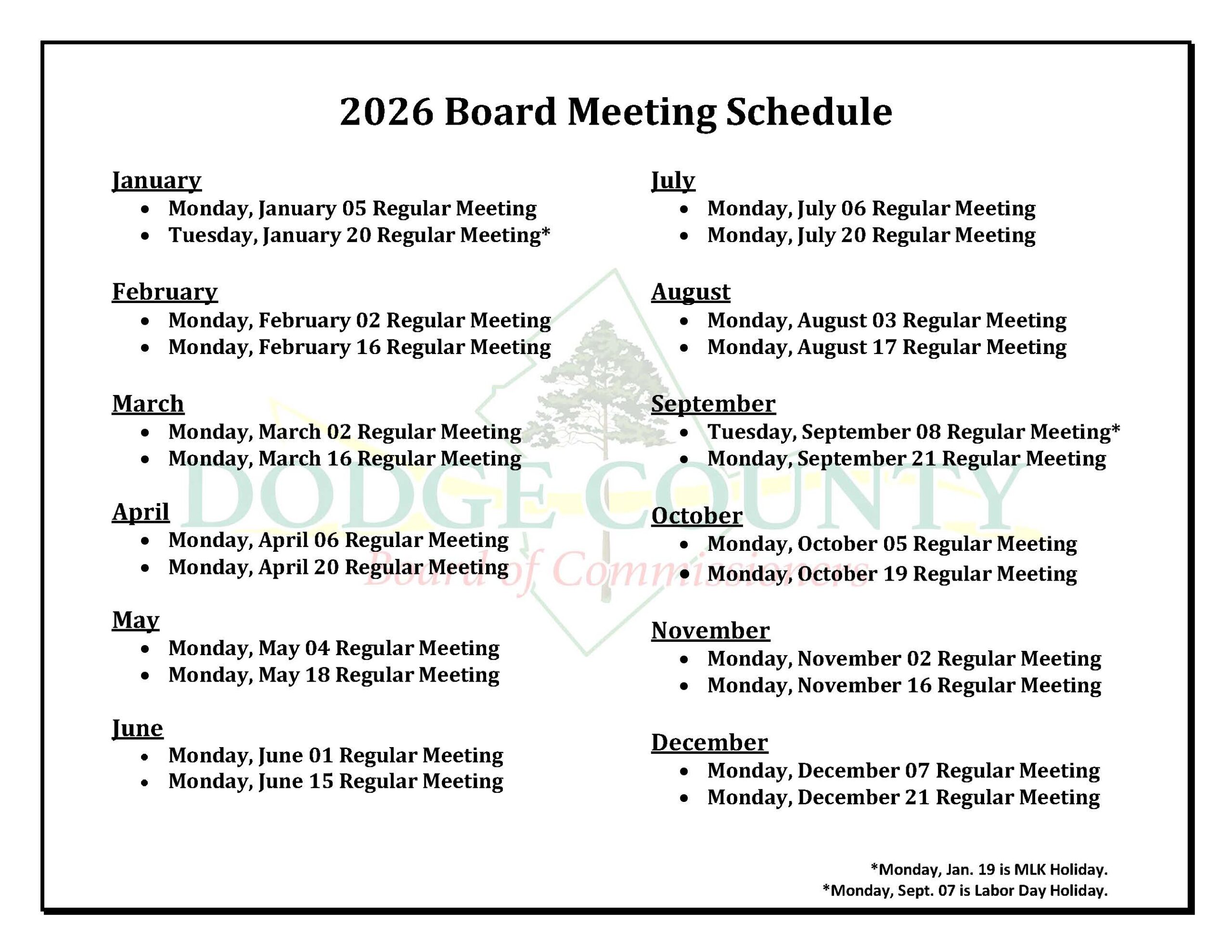 The Dodge County Board of Commissioners meets the first and third Mondays of each month at 6:00 pm in the Courthouse Annex, 643 Pearl Bates Ave. In the event the first or third Monday is a county-observed holiday, the meeting is generally moved to Tuesday.